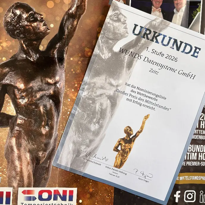 Die Urkunde ist angekommen: WUNDS Datensysteme GmbH wurde für den Wettbewerb „Großer Preis des Mittelstandes“ der Oskar-Patzelt-Stiftung nominiert. Ein großes Dankeschön an die Stadt Zeitz für die Nominierung und die wertschätzenden Worte zu unserer Arbeit.
